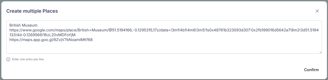If your selected provider is Google API and Google API Key is set, it supports Google Maps place link (https://www.google.com/maps/place/XXX) and Google Maps short link (https://maps.app.goo.gl/XXX).