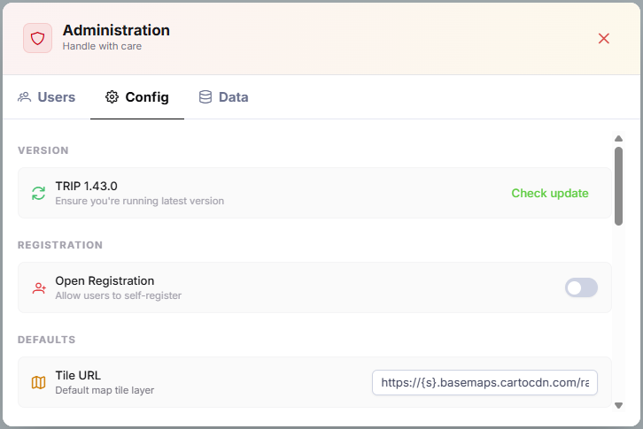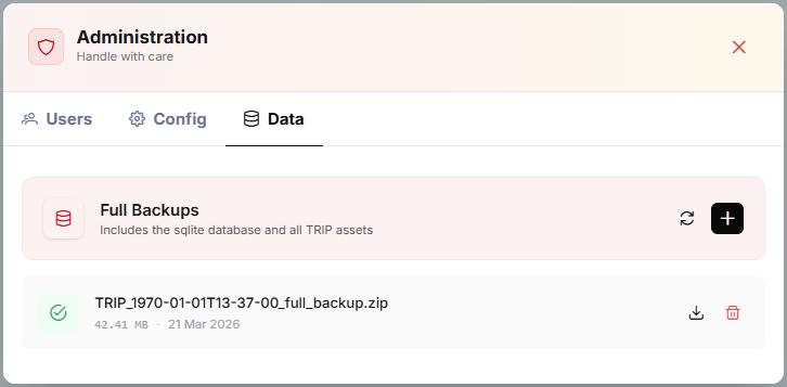 The Data section allows you to generate a complete backup of TRIP data, including all images, attachments, and the database itself.