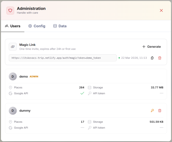 Admin UI allows you to manage users, update the app configuration, make full backups.